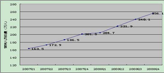 4.营销员队伍数量保持高速增长。近年来,营销员队伍保持了较快增长速度,从2007年1季度的163.5万人发展到2008年底的256.1万人,增幅达56.64%,在促进保险业发展,扩大就业,维护社会稳定方面起到一定程度的积极作用。但是在国际国内经济形势不太乐观的情况下,营销员队伍的过快增长,可能加剧或暴露保险营销体制尚未完全理顺带来的问题。