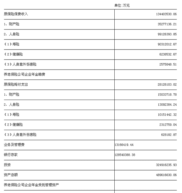 3、原保险保费收入、原保险赔付支出和业务及管理费为本年累计数,银行存款、投资和资产总额为月末数据。