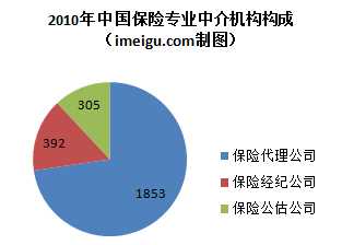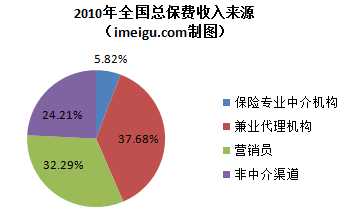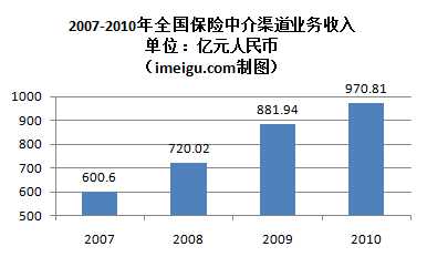 截至2010年底,全国共有保险专业中介机构2550家,兼业代理机构18.99万家,营销员330余万人。全国保险公司通过保险中介渠道实现保费收入10991.14亿元,同比增长19.98%,占全国总保费收入的75.80%。全国中介共实现业务收入970.81亿元,同比增长10.08%。