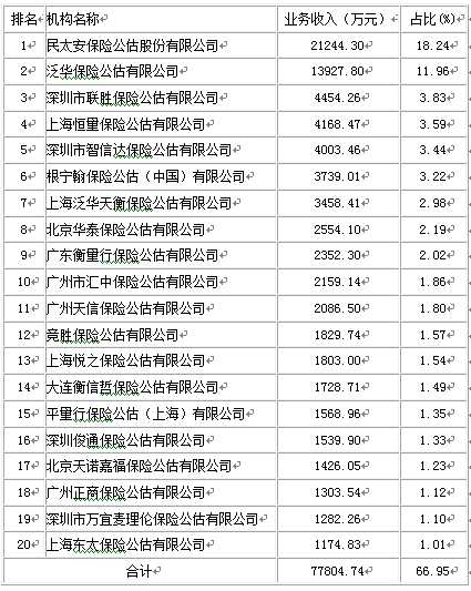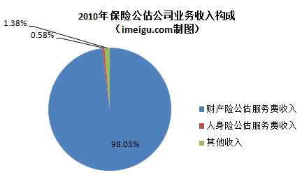 保险公估公司实现业务收入11.62亿元,同比增长2.74%。实现财产险公估服务费收入11.31亿元,其中在2010年财产险公估费收入中,机动车辆险6.31亿元,企业财产险2.31亿元,家庭财产保险315.71万元,货运、船舶险1.47亿元,工程险8070万元。人身险公估服务费收入约607.51万元,其他收入1595.98万元。保险公估公司实现净利润0.45亿元,同比增长18.42%,占保险专业中介机构全部净利润的5.52%。