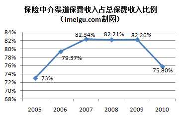2006、2007年,保险中介渠道对保险公司保费收入的贡献度大幅上升;2007-2009年,该比例均保持在82.2%左右;2010年,在保险中介机构数量出现负增长情况的同时,保险中介渠道保费贡献度也大幅下降至75.8%。