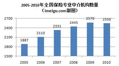 截至2010年底,全国共有保险专业中介机构2550家,比上年度末减少20家。2006年-2009年,全国保险专业中介机构数量较上年分别增加了11.82%、20.47%、4.89%、5.11%。由此可见,保险中介在2006、2007两年间经历了较大规模的机构扩张,此后两年的扩张速度大幅放缓,甚至在2010年出现机构数量萎缩的情况。