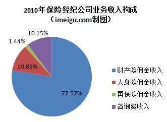 保险经纪公司共实现业务收入43.96亿元,同比增长32.81%。其中,实现财产险佣金收入34.10亿元,同比增长36.29%,占全部经纪业务收入的77.57%;实现人身险佣金收入4.77亿元,同比增长25.53%,占经纪业务收入的10.85%;实现再保险佣金收入6332万元、咨询费收入4.46亿元,占经纪业务收入的10.15%。保险经纪公司实现净利润5.71亿元,同比增长62.22%,占保险专业中介机构全部净利润的70.01%。