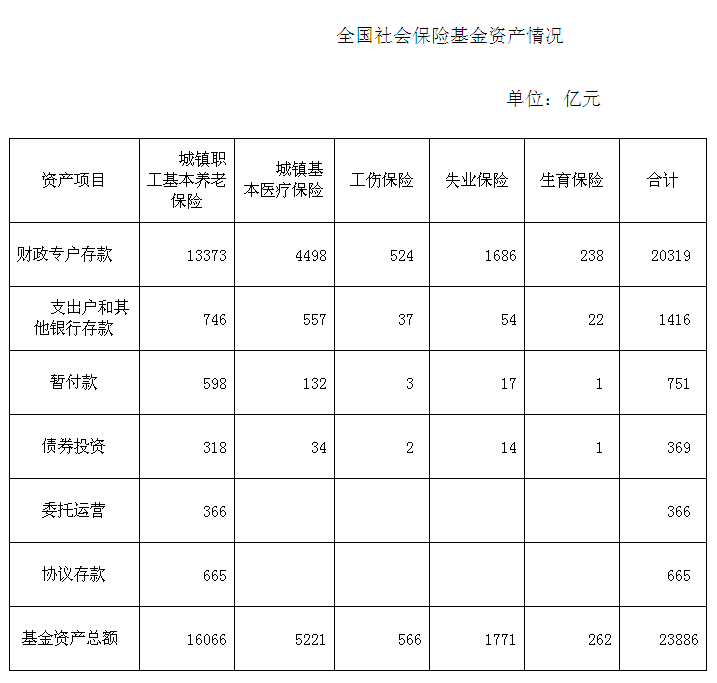 2010年末,全国城镇职工基本养老保险、城镇基本医疗保险、工伤、失业和生育五项社会保险基金资产总额23886亿元。其中,各级政府财政专户存款20319亿元,各级社会保险经办机构支出账户和其他银行存款1416亿元,暂付款751亿元,债券投资369亿元,委托运营366亿元,协议存款665亿元。