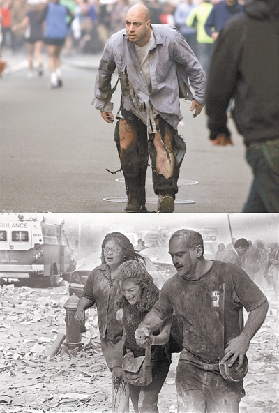 2013年4月16日,在美国波士顿马拉松比赛终点线附近发生两次爆炸,导致至少3人死亡,超过140人受伤。下图为当天在波士顿爆炸现场的市民出来的情景;左图为2001年9月11日“9·11”恐怖袭击之后,市民相互搀扶从事发现场出来的景象。