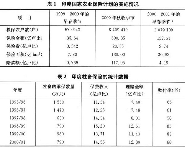 3. 全面开展阶段 到了1999年,印度政府根据以前在农业保险方面积累的大量经验教训和原始的保险数据资料开始全面推行农业保险,主要包括国家农业保险计划、种子作物的保险试验计划和牲畜保险等。新的保险计划比原来的保险试验更具体、保费的厘定也更为科学,使保险的开展更加具有可操作性,从而为印度农业经济的快速发展提供了有力的保护和保障。