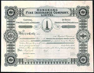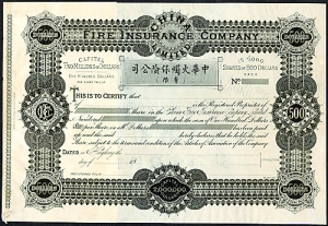 1881年香港火烛保险有限公司 发行的1000美元股票