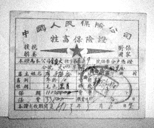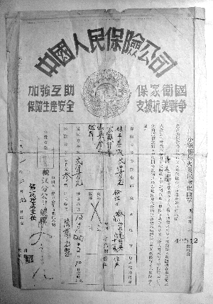 到1952年,承保数量达1400万头,其中40万头牲畜在死亡后得到理赔。此保单是1951年的耕牛保险,上面写着:爱国增产合作互助,抗美援朝保家卫国。这张耕牛保单有别于其他保单的是:一是用作被保险人的保险单证;二是用保险赔款手续凭证,既方便了农民办理保险、又能做理赔手续领赔款。根据当时保险公司经验介绍,保险公司为了配合抗美援朝中心工作,发动群众,并组织小学生成立宣传队进行宣传,开展村与村的竞赛,提出“一头耕牛不保险,半个家当太危险”的口号。在他们心目中,参加保险、爱护耕牛,同样是支援国家建设,保证农业生产,为抗美援朝做贡献。