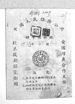 如图二所示,此张保险单是人保公司财产强制保险固定财产保险凭证正本,在保单左上方加盖了“抗美援朝、保家卫国”红色印戳。从保单字面上看,在印好的保险单上加盖宣传标语属不多见,当时保险干部和员工抗美援朝的热情跃然反映在保险单上,单证可贵,精神更可贵。