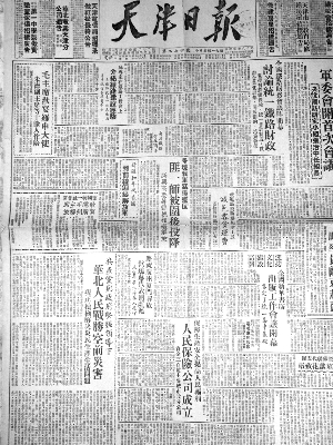 笔者近日收藏到一份1949年10月21日出版的《天津日报》,《天津日报》系天津军管会登记新字第一号报刊,社址在天津多伦道272号。本期为第274号,共四版。一版中下位置有一条醒目的新闻标题“人民保险公司成立”;引题是“保障生产安全提高人民福利”;副题是:“资金三百亿主要城市设分公司”。