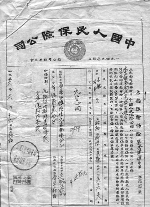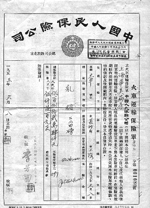 笔者从事保险营销工作,业余醉心于收藏。对建国初期的老保险单情有独钟,这些老保险单是时代变迁的缩影。我收藏的建国初期的老保险单中有运输保险单四枚,分别是 “火车运输保险单”、“汽车运输保险单”、“轮船运输保险单”、“木船运输保险单”。它们都呈现一个共同特点:保险单最上面是繁体的“中国人民保险公司”字样,下面是保徽,纸质发黄,竖式列文,蓝黑印字,收费额度以旧币反映。