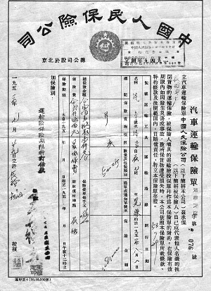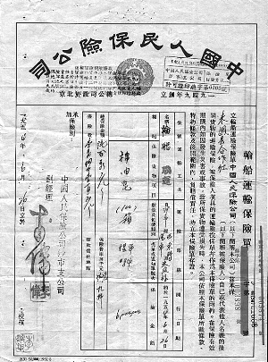 “汽车运输保险单”(图2)是一份1953年7月29日由中国人民保险公司湖南辰溪支公司签发的第76号保险单,单中载明有“装载运输工具”、“运输线路”、“开行日期”、“总保险金额”、“保险费”、“赔款偿付地点”、“保险期限”等,有趣的是“保险货物项目”一栏填的是“洋灰”,即今天的“水泥”。左下角有支公司经理“王蕴志”的签章,保单的背后印着“汽车运输保险单条款”,内容共分三章,“第一章责任范围,第二章保险期限,第三章赔款处理”。
