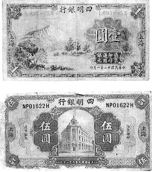 四明银行发行的1元钞票正面为四明山景图,5元钞票正面为四明银行大楼外景