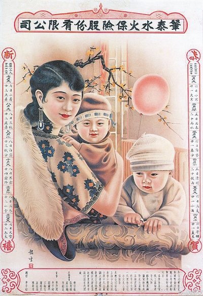 右上图为“肇泰水火保险股份有限公司”1932年印行的月份牌,主图画面为一位身着时尚旗袍加外套服饰的年轻母亲和两个孩子在一起。此为铭生画作。